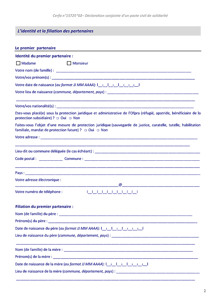 - La convention de PACS : les futurs partenaires sont libres de rédiger eux même la convention ou d’utiliser le modèle de convention cerfa n°15726*02 disponible sur le site du service public.
