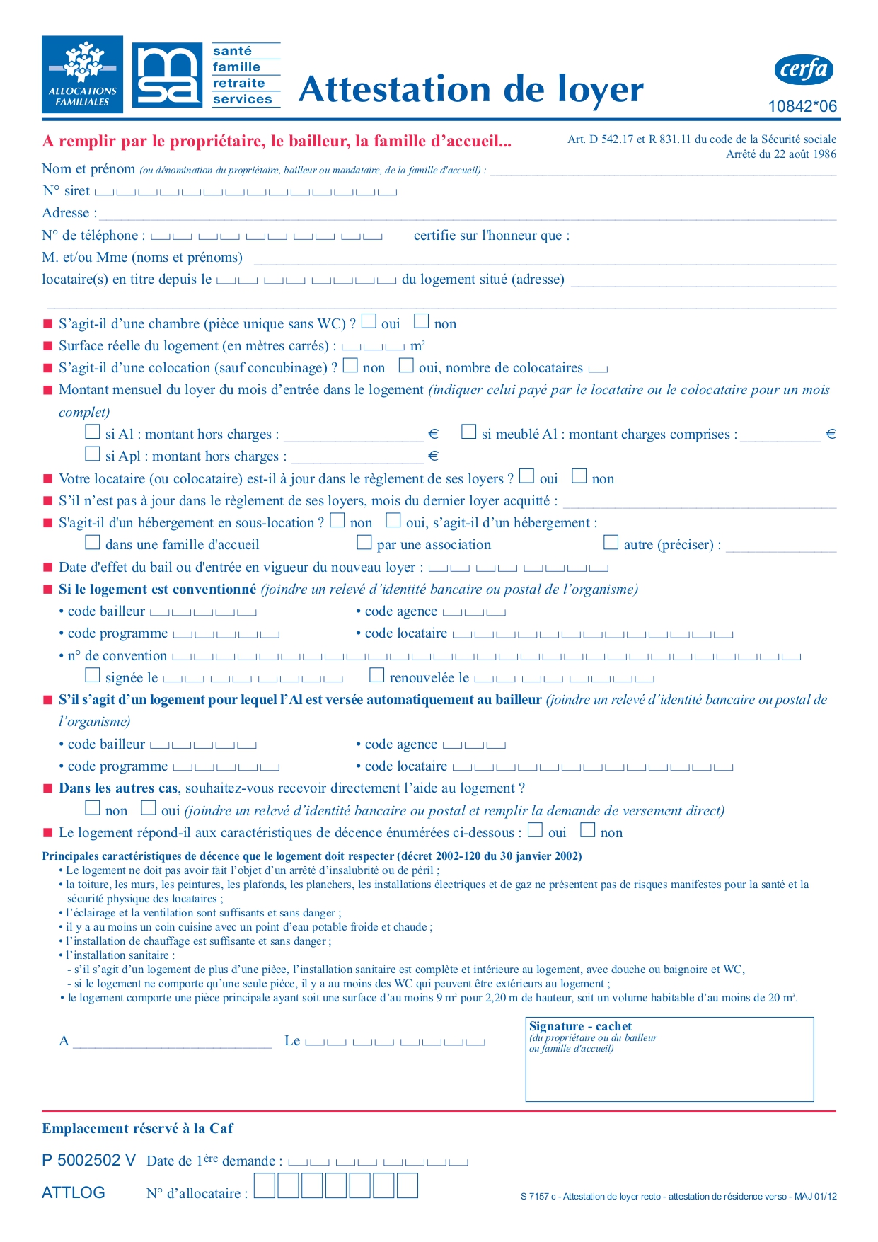 L’attestation de loyer (Cerfa n°10842*06) est un document obligatoire que le locataire doit faire remplir par le bailleur et adresser à la CAF afin de bénéficier de certaines aides au logement qui lui seront allouées en fonction de sa situation :