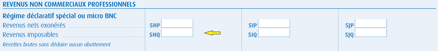 Dans le cas d’une activité de prestations de services relevant des bénéfices non commerciaux, il faut alors remplir le cadre « revenus non commerciaux professionnels ». Vous devrez compléter la case 5HQ indiquée par la flèche jaune comme suit :