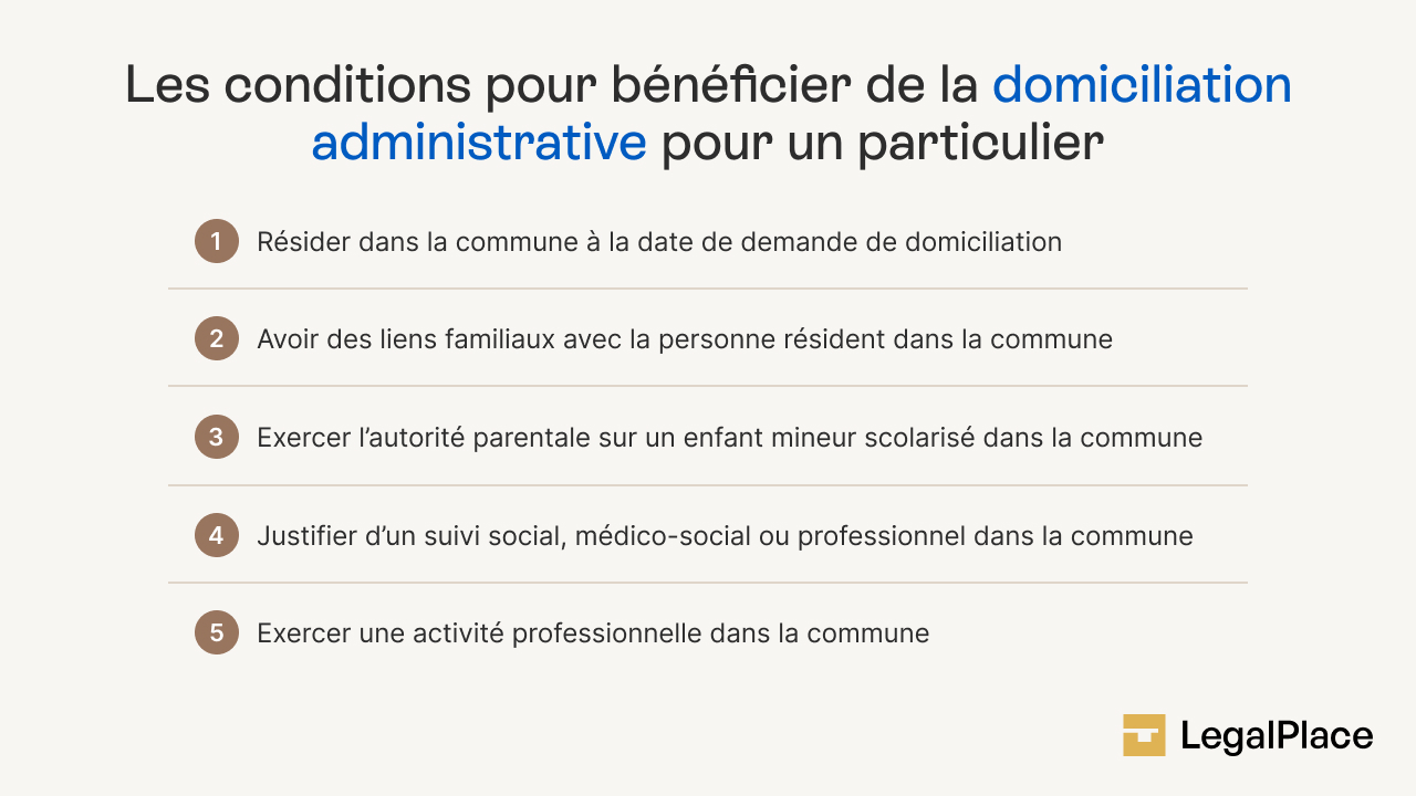 Voici un schéma des conditions pour bénéficier de la domiciliation administrative pour un particulier :