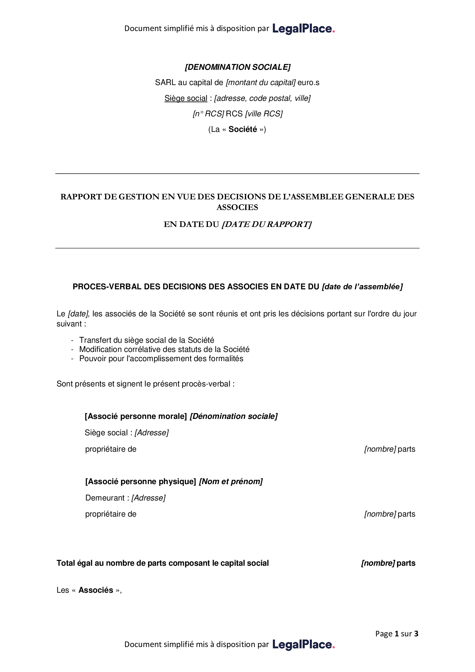 Le procès-verbal d’assemblée générale (PV d’AG) constatant la décision de transférer le siège social d’une SARL doit comporter un certain nombre de mentions obligatoires. Le modèle suivant peut être utilisé et adapté aux spécificités de la société concernée.